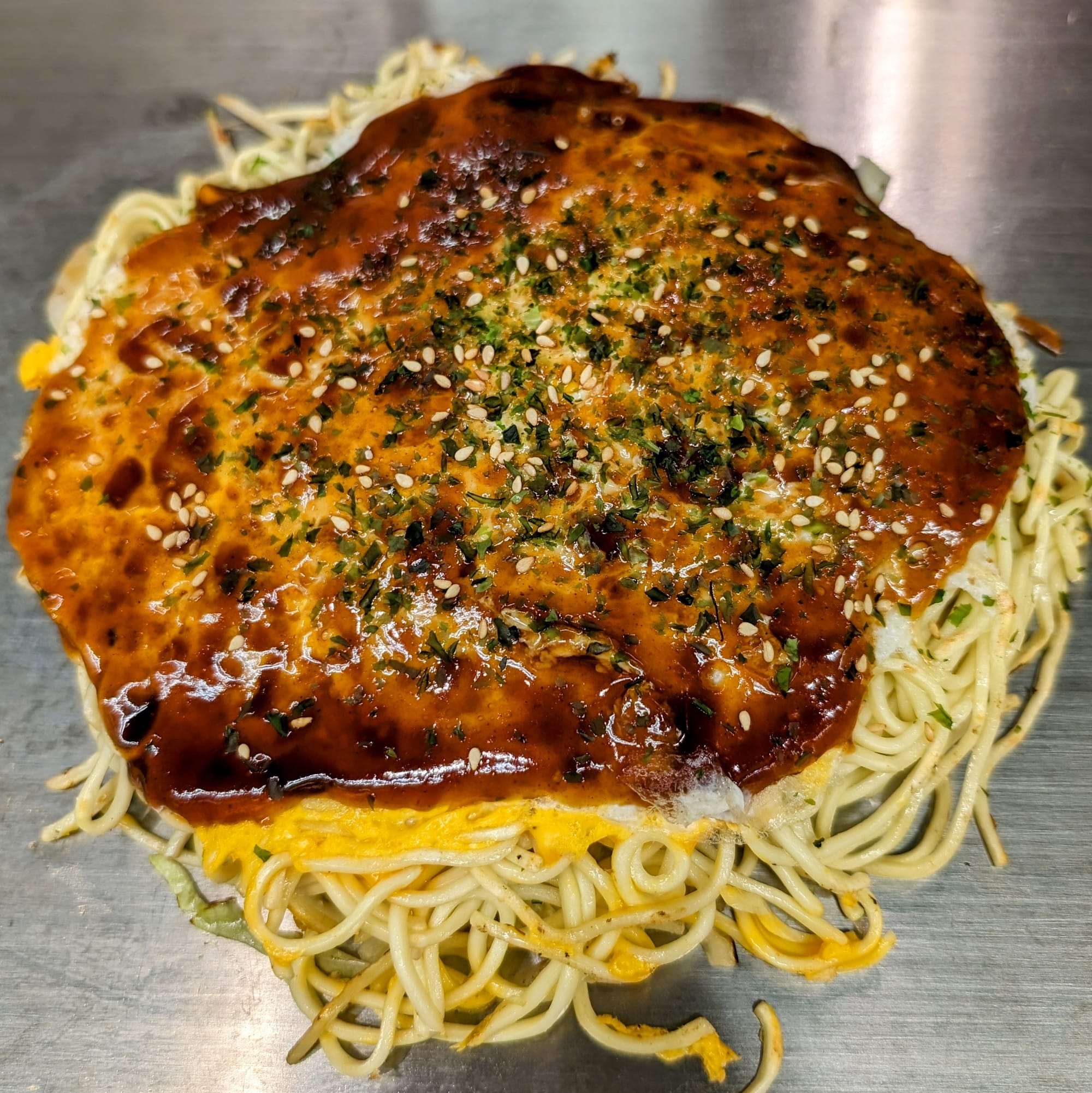 The word "pancake" is only a weak description for that. Basically soba noodles, cabbage, eggs, bean sprouts, with different toppings like meat, fish, shrimps and of course Okonomiyaki sauce. Yummy 😋